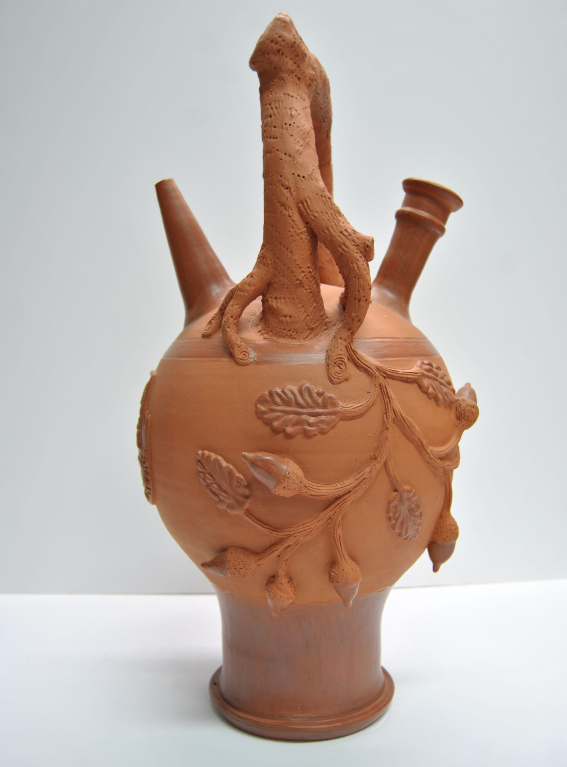 À DIREITA: Moringue do final do século XIX/ início do século XX, utilizado para manter água fresca, da Olaria Alfacinha, fundada em Estremoz pelo mestre oleiro Caetano Augusto da Conceição, com motivos de bolotas e folhas de azinheira, e pega a imitar um ramo de azinheira. © Museu Municipal de Estremoz Prof. Joaquim Vermelho
